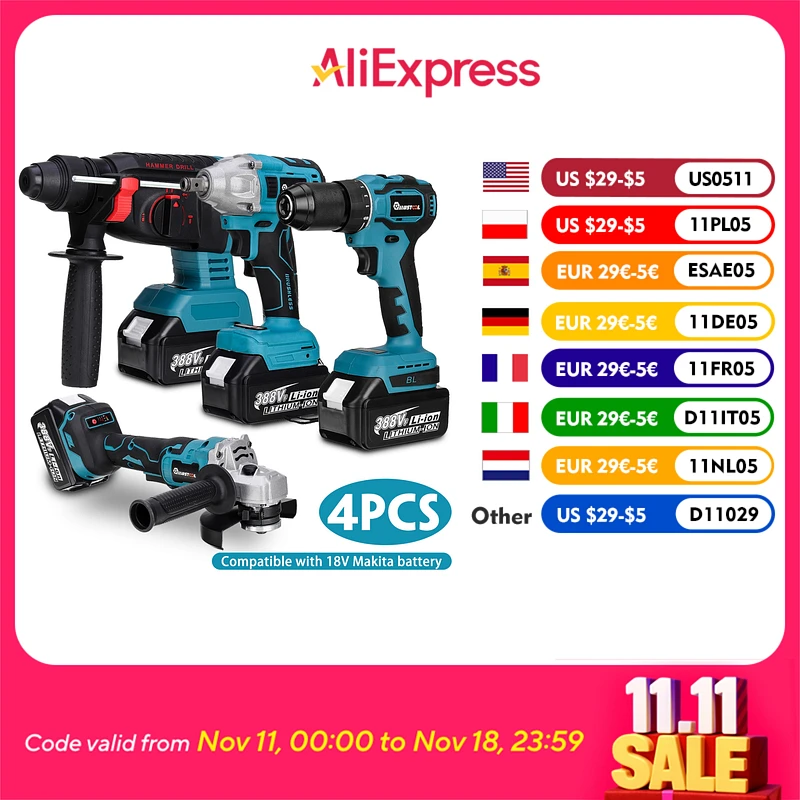 Drillpro 4 in 1 Professional Tool Set 800N.M Electric Wrench, Hammer, Power Drill Machine, Angle Grinder For 18V Battery