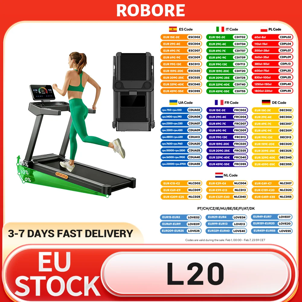 Bieżnia ROBORE L20, silnik bezszczotkowy 3.5HP, regulowana nachylenieść do 15%, prędkość 14 km/h, maksymalne obciążenie 180 kg, pas biegowy 40×107 cm, LED
