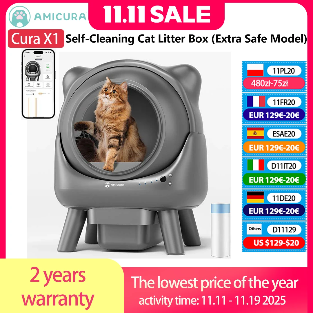 Automatyczna kuweta dla kota Amicura Cura X1 z funkcją samooczyszczania, sterowaniem przez aplikację, czujnikiem bezpieczeństwa i łatwą w czyszczeniu elektryczną tanią.