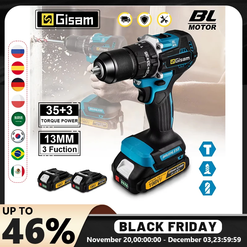 Gisam 65N.m 13MM 35+3 Torque Brushless Electric Impact Drill Cordless Electric Screwdriver Power Tool For Makita 18V Battery Pin