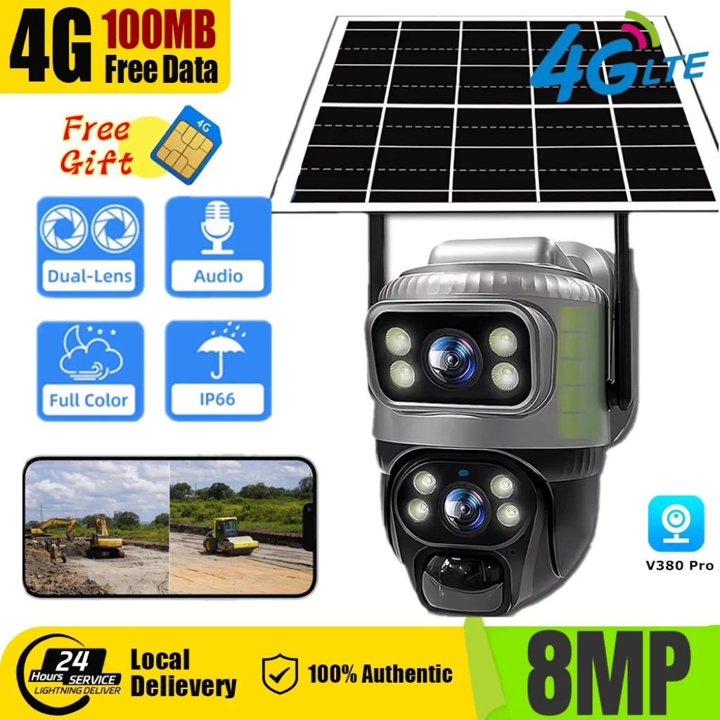 Kamera solarna 8MP 4K z obsługą kart SIM 4G, zewnętrzna, z podwójnym obiektywem, detekcją ludzi PIR, noktowizją, wodoodporna, zasilana baterią solarną, monitor CCTV.