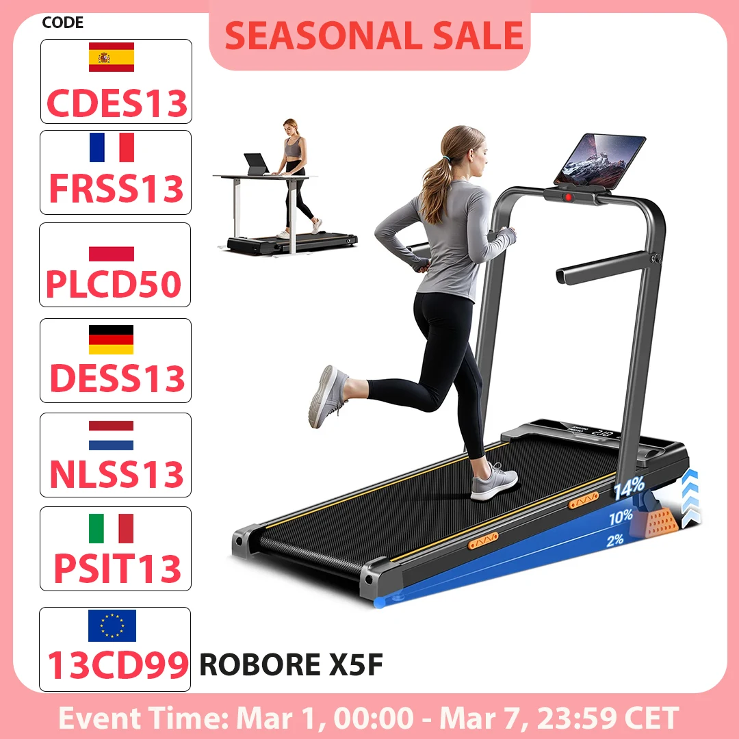Składana bieżnia ROBORE X5F z nachyleniem 14%, cichym silnikiem 2,5 KM, maksymalną prędkością 10 km/h, udźwigiem 150 kg, 3-stopniowym nachyleniem, wyświetlaczem LED