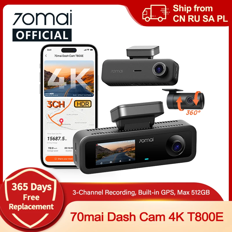 70mai 3-Channel Dash Cam T800E 4K HDR F1.55 Aperture Supercapacitor Voice Control GPS Car DVR 70mai T800E WiFi 6 5GHz