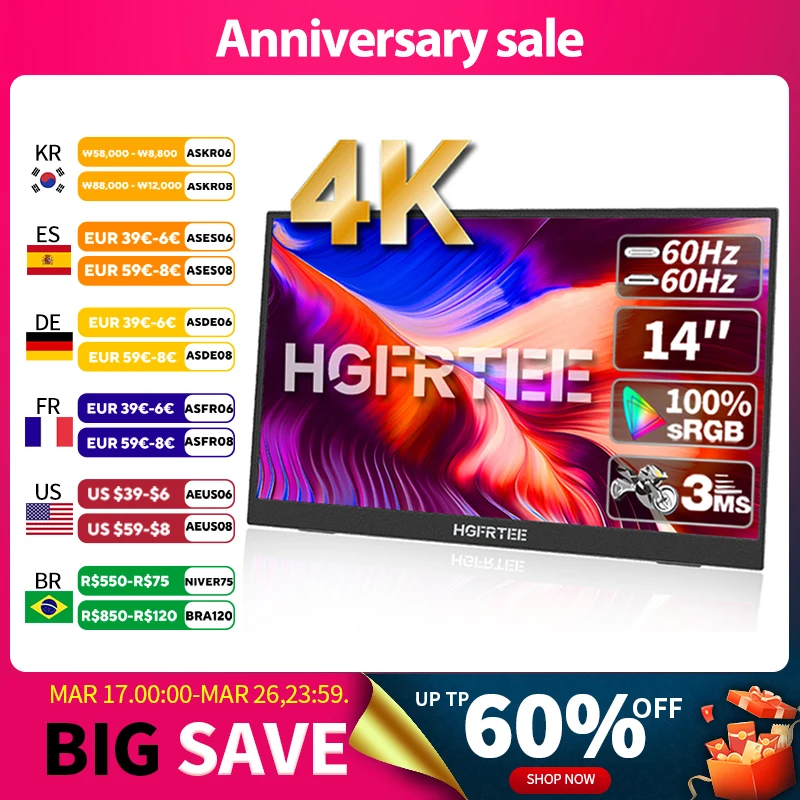 HGFRTEE 14-calowy przenośny monitor 4K 3840*2160 100% SRGB ADS-IPS rozszerzony wyświetlacz ze wspornikiem do przełącznika telefonu laptopa PC