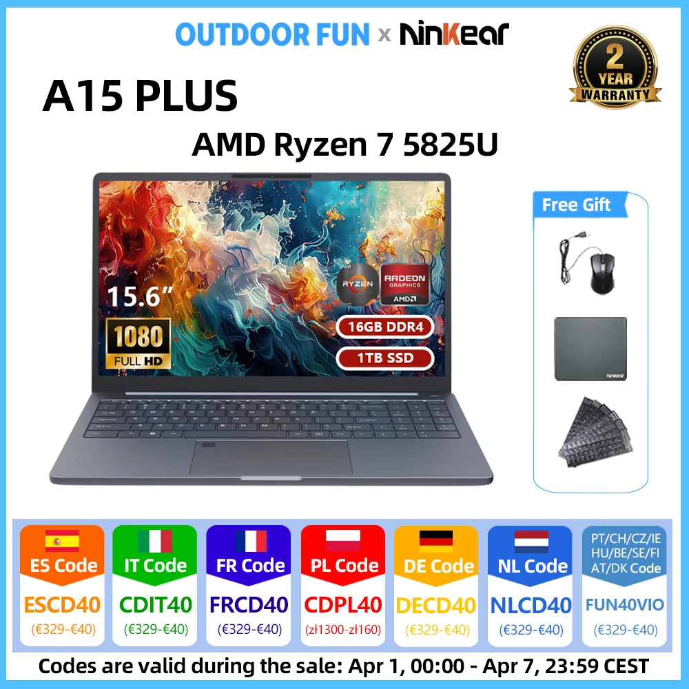 Laptop Ninkear A15 PLUS 15,6 cala IPS FHD AMD Ryzen 7 5825U, 16 GB DDR4 + 1 TB SSD, WIFI 6, Windows 11 PRO, komputer do biura